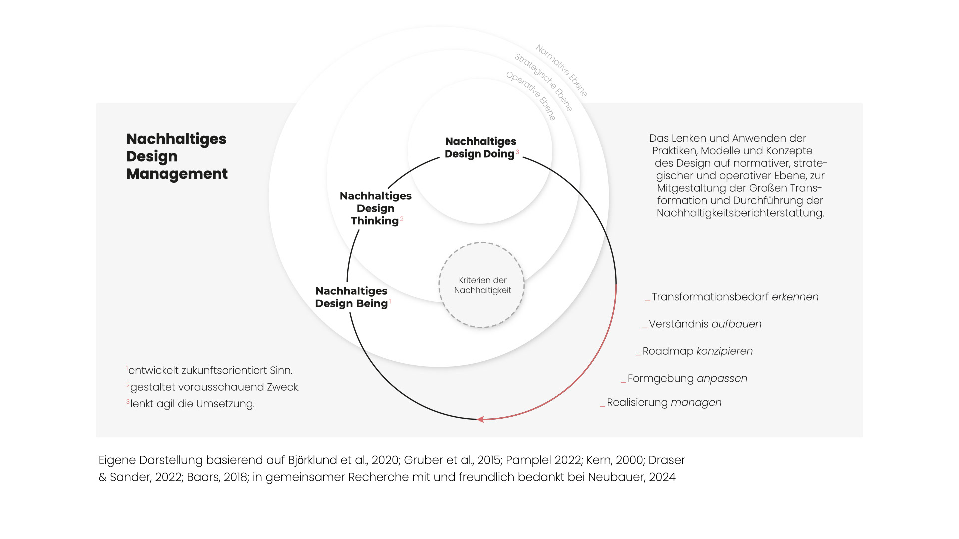 In Folge einer Untersuchung des Forschungsstandes kann Nachhaltiges Design Management als das Lenken und Anwenden der Praktiken, Modelle und Konzepte des Design auf normativer, strategischer und operativer Ebene, zur Mitgestaltung der Großen Transformation und Durchführung der Nachhaltigkeits-berichterstattung verstanden werden.