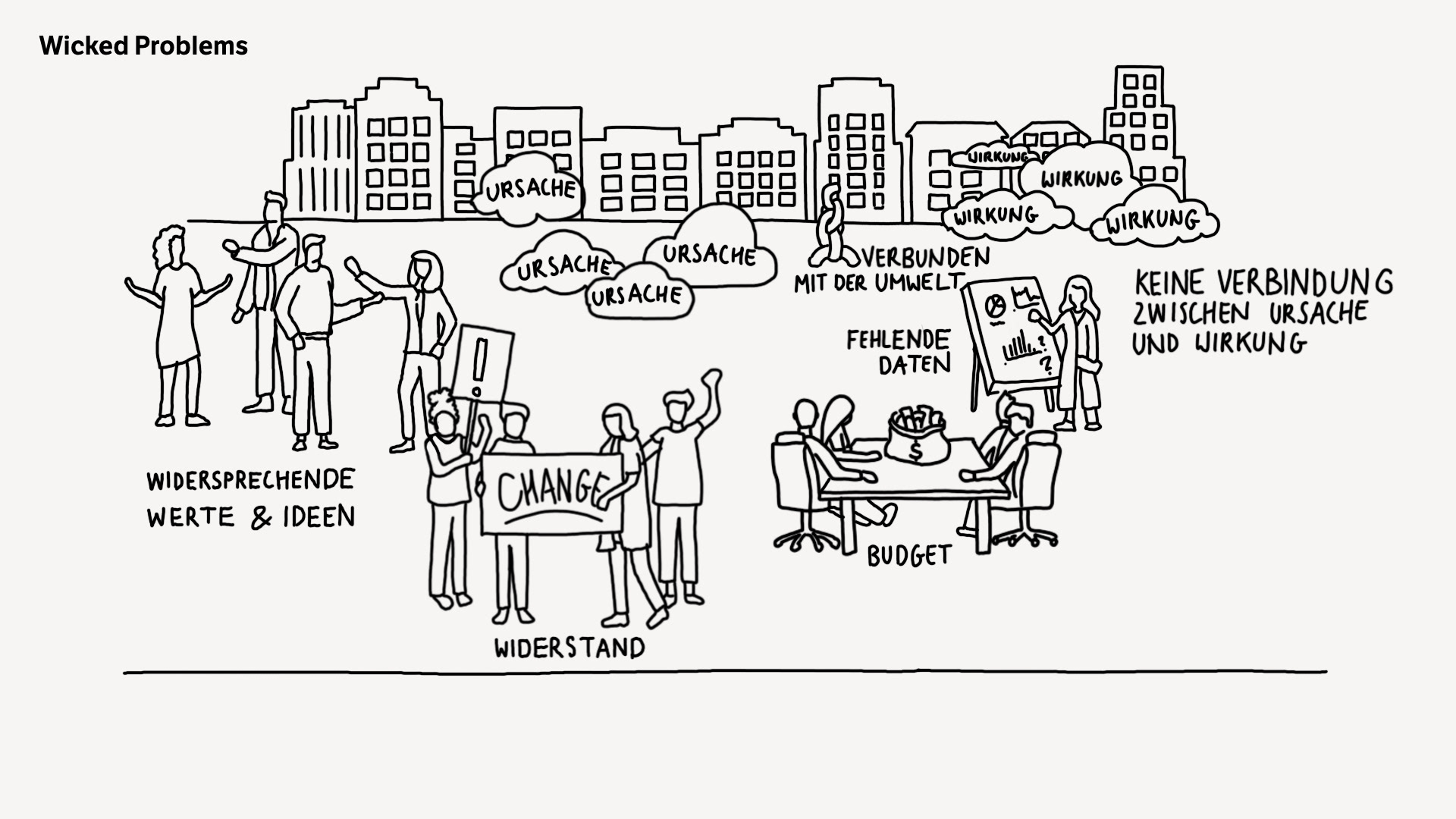 Das kann als „Wicked Problem“ bezeichnet werden. Es gibt keine klare Problemlösung, da auch nicht klar ist, wie sich das Problem ganzheitlich auswirkt. Es ist wichtig, die Bedürfnisse, Ideen, Fähigkeiten und Situationen aller beteiligten Akteure wahrzunehmen. In kollaborativen Prozessen können dann Ideen entwickelt und umgesetzt werden, um zu überprüfen, ob sich dadurch die Umstände der Betroffenen positiv entwickeln.